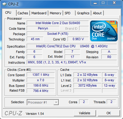 Intel Core 2 Duo SU9400: 1,4 ГГц; 3 Мбайт L2; два вычислительных ядра