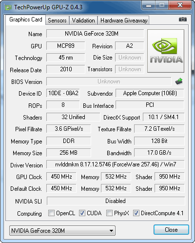 Ключевой его элемент – интегрированное графическое ядро NVIDIA GeForce 320M, содержащее 48 унифицированных процессоров и 16 текстурных блоков. А вот собственной видеопамяти у этого решения нет – ядро использует разделяемую системную память.