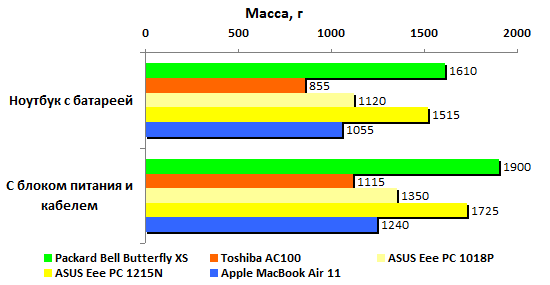 MacBook Air 11 весит чрезвычайно мало – как сам по себе, так и в комплекте с блоком питания. Однако следует иметь в виду, что для достижения столь невысокой массы и столь небольшой толщины корпуса конструкторам пришлось задействовать не слишком емкий «плоский» аккумулятор.
